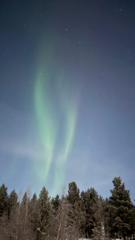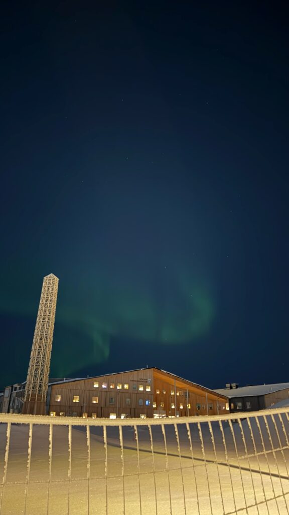 Estávamos voltando de uma caçada e chegamos em Kiruna — a cidade onde estávamos hospedadas — quando a aurora apareceu de novo. Dessa vez, sobre a cidade. Saímos correndo do hotel como se fôssemos perder o trem. Casacos abertos, câmeras na mão, rindo e gritando.